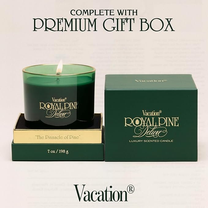 • PREMIUM GIFTABLE DESIGN: Hand-poured and encased in a premium gift box, Vacation Royal Pine Deluxe makes the perfect hostess gift, house warming gift, or teacher Christmas gift. With its elegant, evergreen weighted glass and gold foil detail, Royal Pine Deluxe is more than just home Christmas decor, it’s a statement of festive sophistication and timeless luxury.