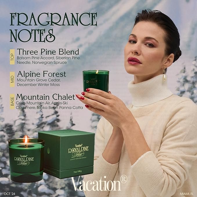 • ALPINE FRAGRANCE NOTES: Royal Pine Deluxe features Vacation’s Signature Three Pine Blend (Fresh Cut Balsam, Siberian Pine Needle, Norwegian Spruce) with a seasonal touch of “Alpine Forest Terroir” (Mountain Grove Cedar, December Winter Moss) and “Swiss Mountain Chalet” (Crisp Mountain Air, Après-Ski Winter Cashmere, Tonka Bean Panna Cotta).
