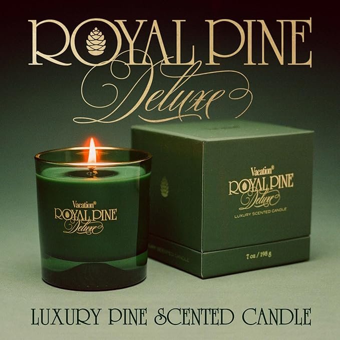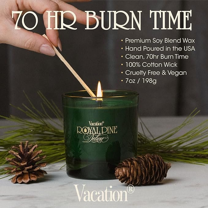 Royal Pine Deluxe Pine-Scented Candle by Vacation Sunscreen – Premium Soy-Blend Wax, 70-Hour Long Burning, Winter House Decor, Gift for Women & Men, 7 Oz.